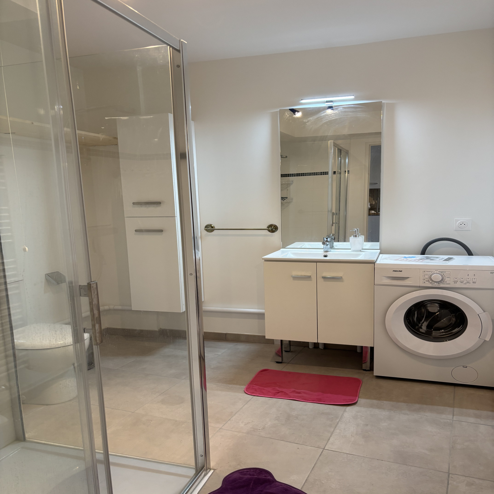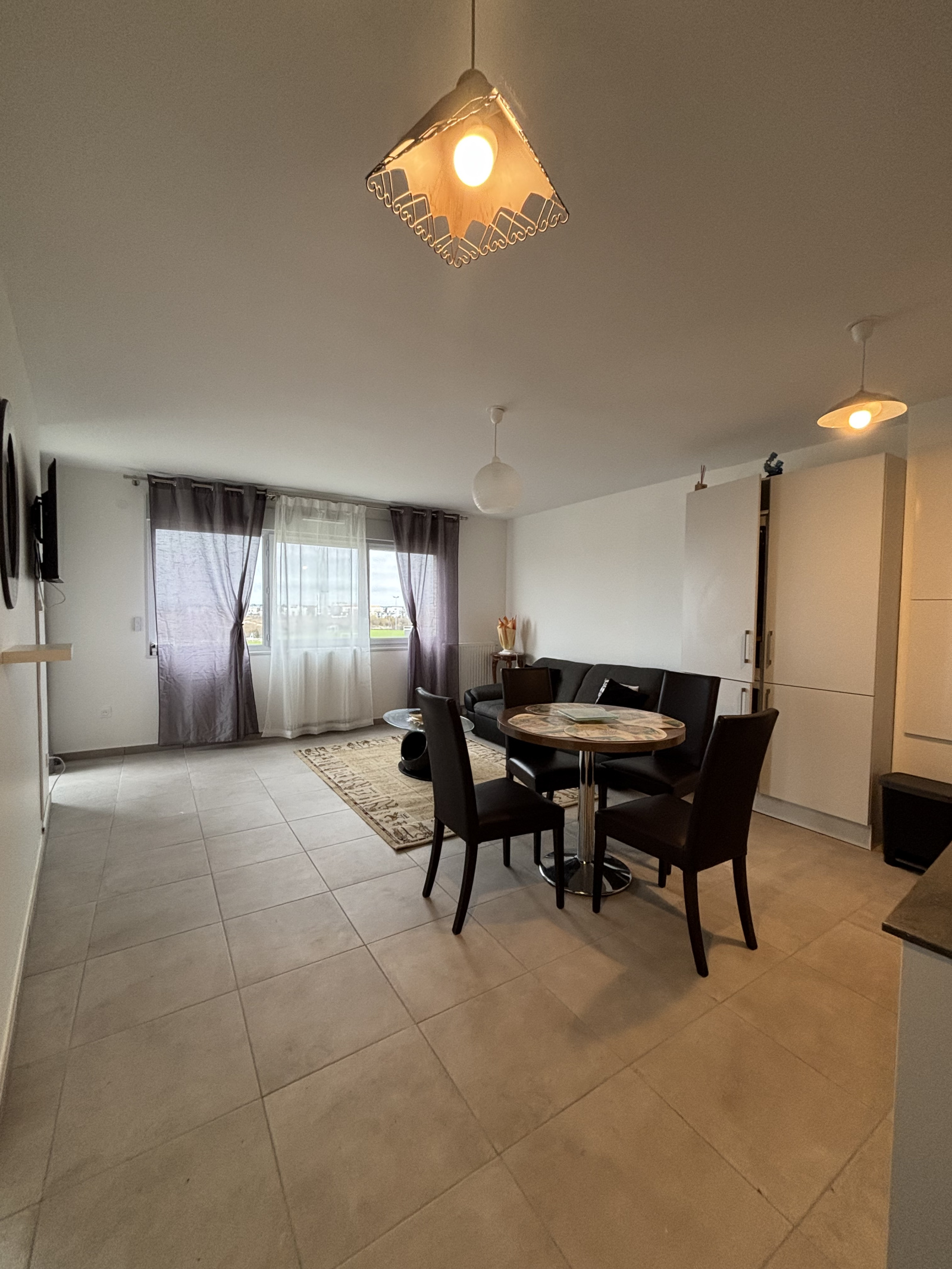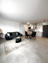 Ct appartement comprend une pièce de vie avec une cuisine moderne entièrement équipée, une chambre, une salle d’eau ainsi qu’une terrasse.